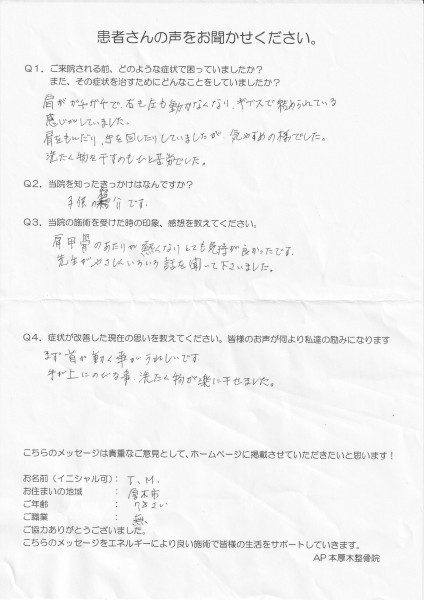 半年前、バレーボールの試合でスパイクを打った時に右肩に激痛が走りました。 以後、その痛みは消えず、練習に行くことも出来なければ日常生活にも影響が出た為、1週間後に整形外科に通院。 五十肩だから、2年間くらいは治らないかもしれないと診断されました。 当院に通院するまではバレーボールも休部し、毎日ストレッチするも一向に改善されませんでした。 初めは悲鳴をあげるほど痛かった治療が、回数を重ねるごとに(3回)痛みがなくなっていきました。練習できなかった半年はいったい何だったんだろう、もっと早く治療を受けていればよかったと思いました。 もうバレーボールはできなくなるかなと思っていたのが、うその様に回復したのには正直びっくり。退職後の余暇の楽しみが1つ無くなってしまうという心配がなくなり、今はとても充実した生活が遅れています。 治療を受けて良かったと感謝しています。ありがとうございました! (中川洋太 様 60代 厚木市 非常勤講師) ※効果には個人差があります |