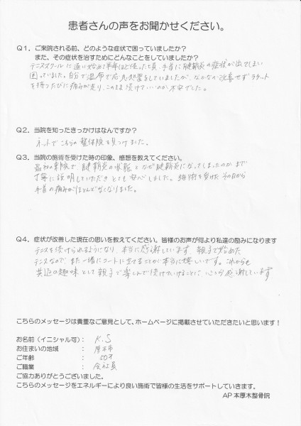 テニススクールに通い始めて半年ほど経った頃、手首に腱鞘炎の症状が出てしまい困っていました。自分で湿布で応急処置をしていましたが、なかなか改善せずラケットを持つたびに痛みが走り、このまま続けていいのか不安でした。 ネットでこちらの整体院を見つけました。 最初の来院で、腱鞘炎の状態と何故腱鞘炎になってしまったのかまで、丁寧に説明して頂き、とても安心しました。 施術を受けたその日から手首の痛みがほとんどなくなりました。 テニスを続けられるようになり、本当に感謝しています。 (K・S様 厚木市 50歳 会社員) ※効果には個人差があります |