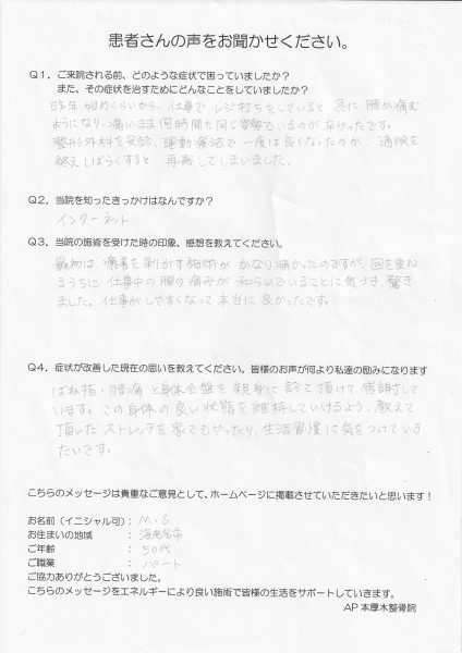 「腰痛が改善しました!」 肩こりと腰痛があり、インターネットで検索して来院してみました。